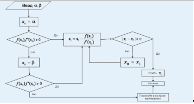 На рисунке приведена блок-схема алгоритма решения нелинейного уравнения методом
