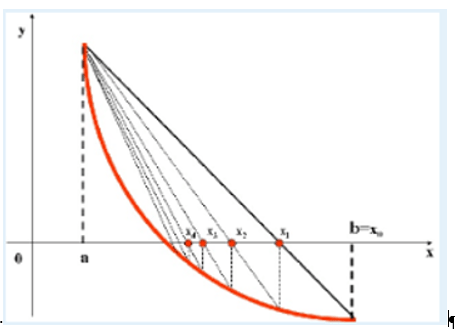Выберите формулу метода хорд для нахождения корня на отрезке, изображенном на рисунке.